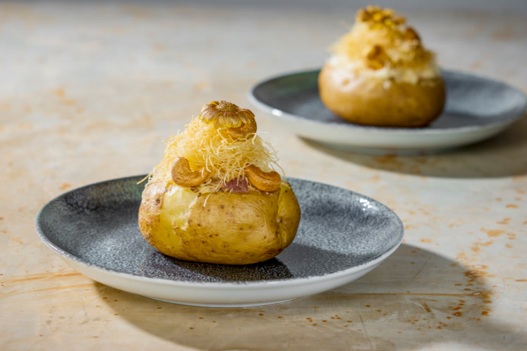 Ovengepofte aardappel met Entrecote, krokante truffel kataifi, goud gespoten cashewnootjes en een goudgespoten bloemetje.Benodigdheden