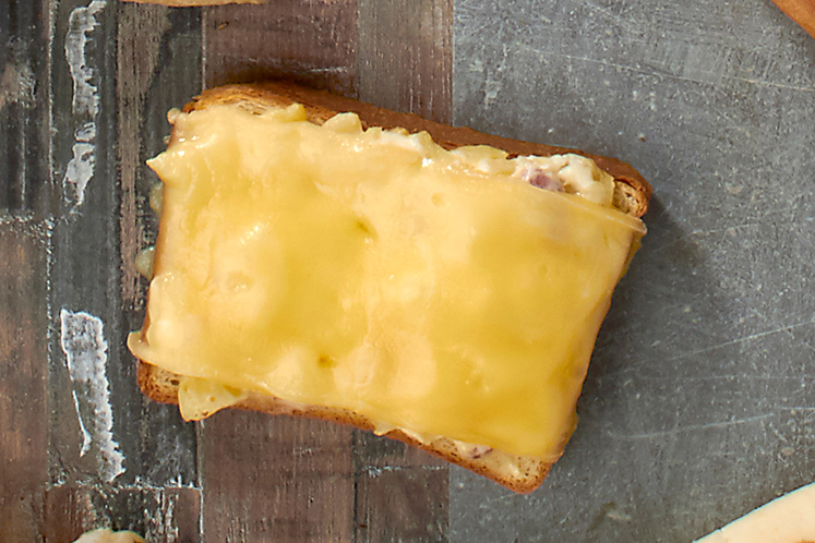 2. Leg wat aardappelgratin op het brood en dek het geheel af met een plak raclette kaas.