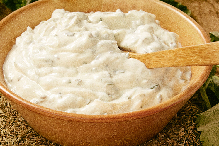 Friszure raita van dikke yoghurt met komijn en citroenmelisse. Perfect als verkoelend bijgerecht of dipsaus.Benodigdheden