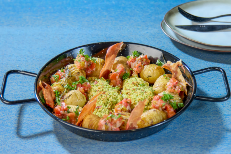 Rode mul met kruidenkorst, hasselback aardappelen en pittige salsa