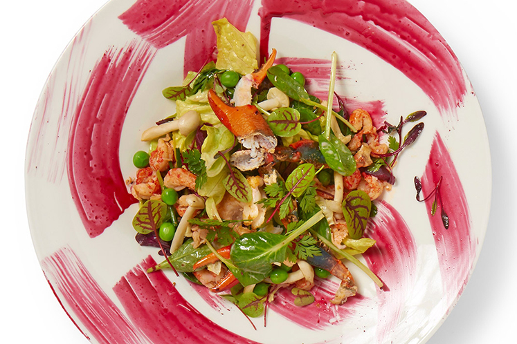 Luchtige salade met rivierkreeft, gerookte biet, veldsla en doperwten, afgewerkt met sesamdressing en strepen van ingekookt bietensap.