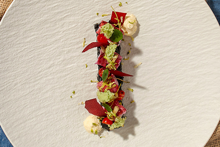 Dit gerecht bestaat uit scholfilet, rode biet, wasabi en ‘risotto’ van zwarte fregula.Benodigdheden