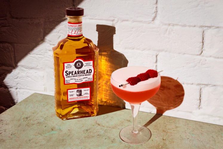 - Voeg de Spearhead Single Grain Scotch Whisky, het citroensap, de droge vermouth, het suikersiroop en het eiwit hieraan toe en schud goed.