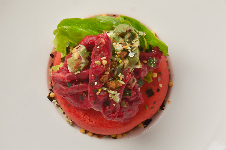 - Stoom de rode bao broodjes warm en snijd doormidden. Spuit wat wasabimayonaise op de bao, leg de warme krab erop en garneer met fijngehakte wasabibolletjes.