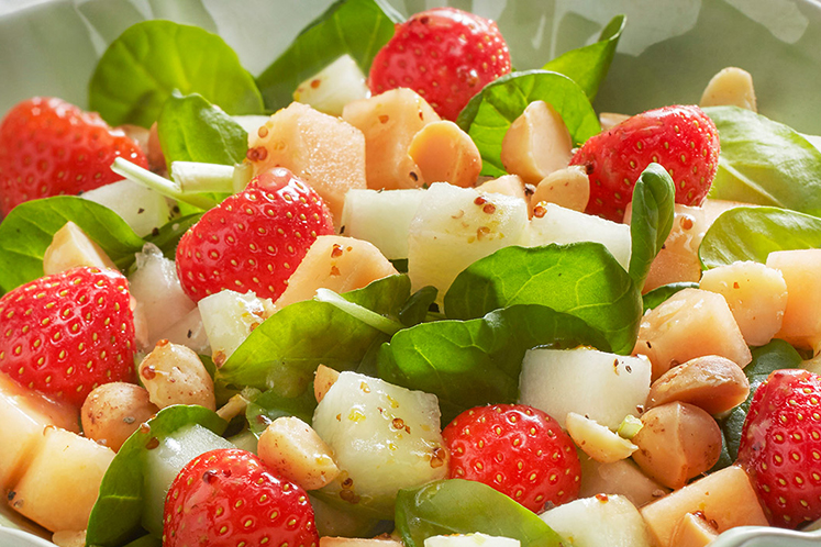 Spinaziesalade met aardbeien en macademianoten, gemaakt met het verse, gesneden fruit van HANOS.Benodigdheden