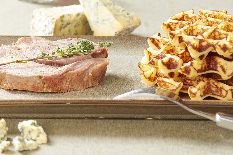 Sunday roast van kalfspeeseind met blue stilton wafeltjes.