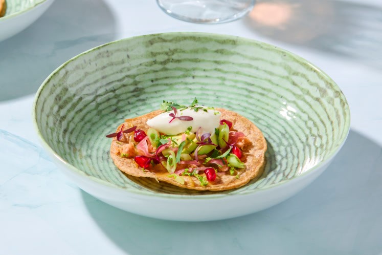 Een heerlijk vegan gerecht bomvol frisse smaken. Tortilla met gesmolten vegan cheddar, getopt met vegan sour cream, vegan tonijn, sexy sauerkraut en granaatappel.