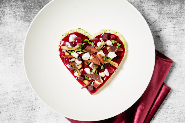Couscoussalade met rode biet en geitenkaas in de vorm van een hart.Dit gerecht bestaat uit: