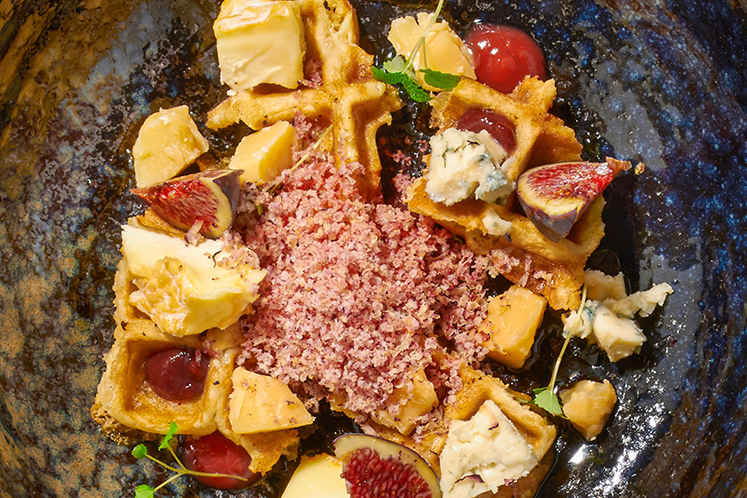 Dit gerecht bestaat uit een wafel met Lady’s Blue, Epoisses en Oud Brugge met daarbij geraspte vijg.