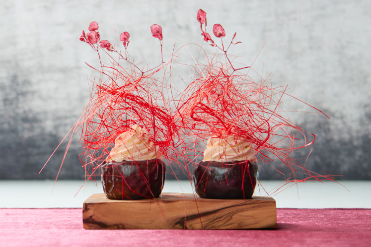 - Smelt voor de garnering de spinsuiker met een beetje rode kleurpoeder tot compleet vloeibaar.