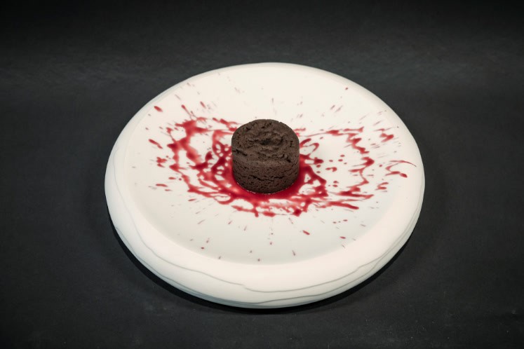Zwart sesamcakeje met bloedend hart van framboos