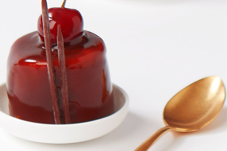 1. Vul dresseerringen met een plakje brownie, kersen compote en kersenmousse.